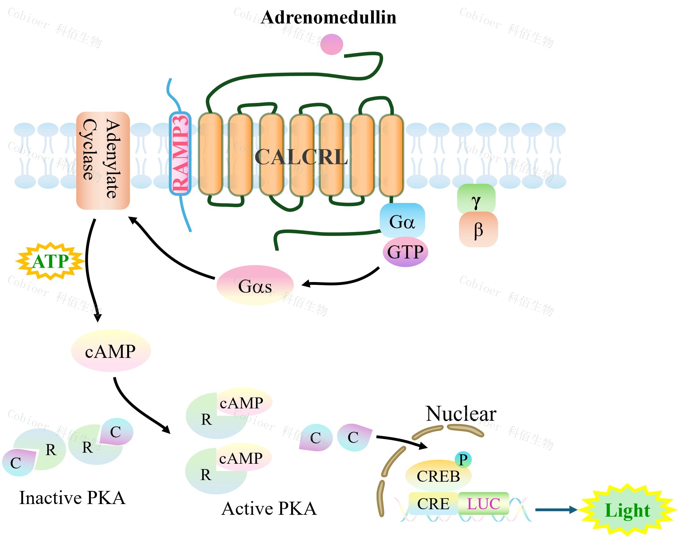 | 降鈣素基因相關(guān)肽(CGRP)家族包括 CGRP 本身、降鈣素(CT)、腎上腺髓質(zhì)素 (AM)和胰島淀粉樣肽(AMY)。 Adrenomedullin 2(AM2),亦稱(chēng)中間腎上腺髓質(zhì)素,是一種由 52 個(gè)氨基酸構成的多 肽激素,廣泛表達于心血管、腎臟及脂肪等組織,作為一種強效的血管舒張因子,在調節 血壓、體液平衡及抑制炎癥反應中發(fā)揮著(zhù)關(guān)鍵作用。CALCRL(也稱(chēng)為 CLR 或 CRLR)是 核心的 G 蛋白偶聯(lián)受體單元,但自身無(wú)功能性;RAMP3 作為必需的伴侶蛋白,不僅協(xié)助 CALCRL 轉運至細胞膜,更決定了該復合物特異性地識別并高親和結合 AM2,從而形成完 整的腎上腺髓質(zhì)素 2 型受體。 配體結合后,復合物與 G 蛋白相互作用,Gαs 亞基從復合物中分離并激活腺苷酸環(huán)化 酶,產(chǎn)生 cAMP。細胞內 cAMP 濃度升高刺激 cAMP 依賴(lài)的信號通路,最終導致轉錄因子 cAMP 應答元件結合蛋白(CREB)與 CRE 啟動(dòng)子結合,誘導基因表達。 |