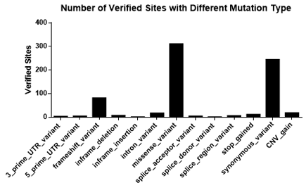 圖3. 不同突變頻率的位點(diǎn)數(shù)(經(jīng)過(guò)驗(yàn)證的位點(diǎn)) 6. 突變類型全覆蓋,有UTR區(qū)域,有內(nèi)含子,有外顯子,有錯(cuò)義突變,有同義突變,有供體變異等等;