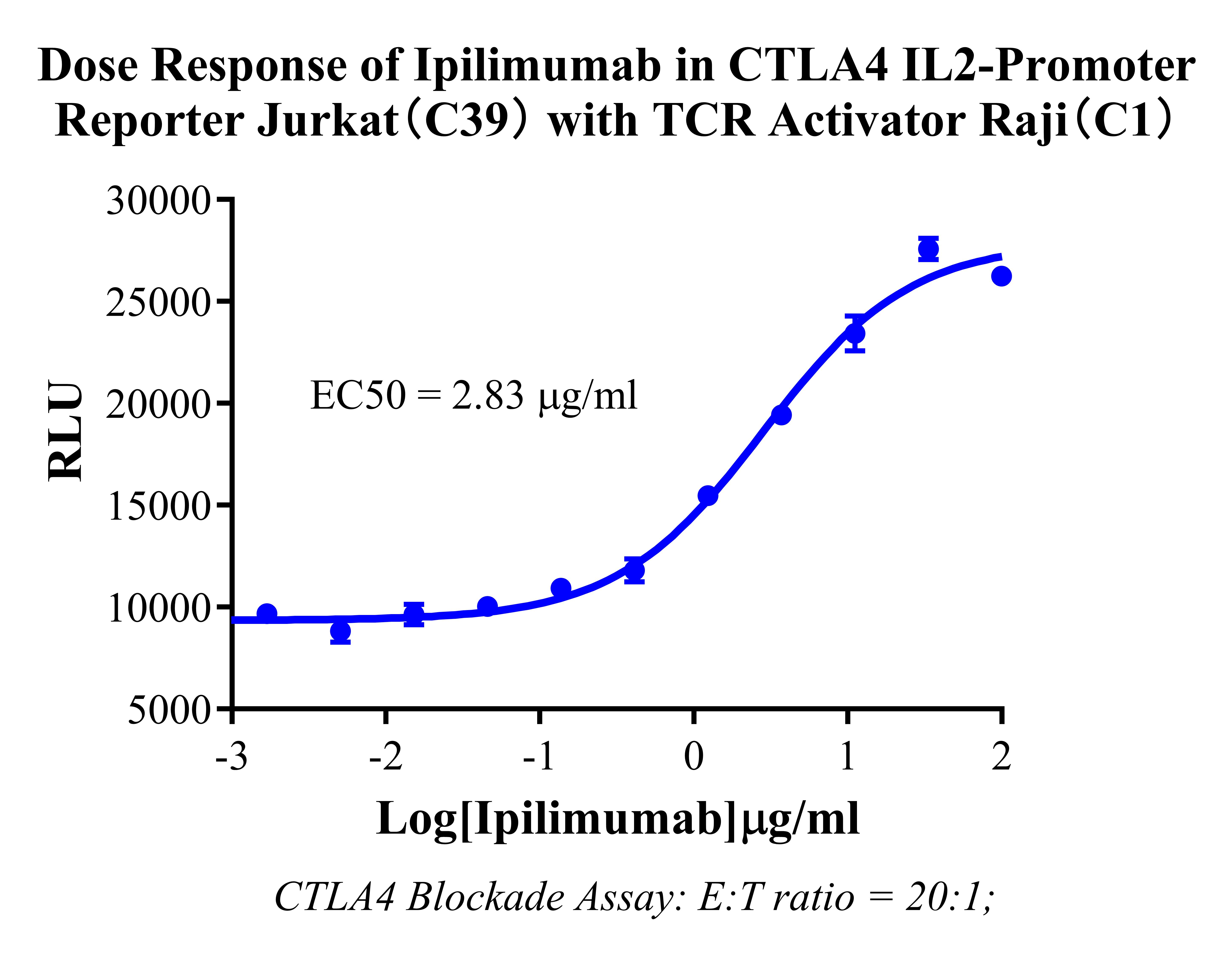 Figure 2. Dose Response of lpilimumab in CTLA4 IL2-Promoter Reporter Jurkat(C39) with TCR ActivatorRaji(C1).