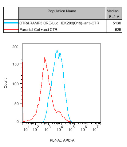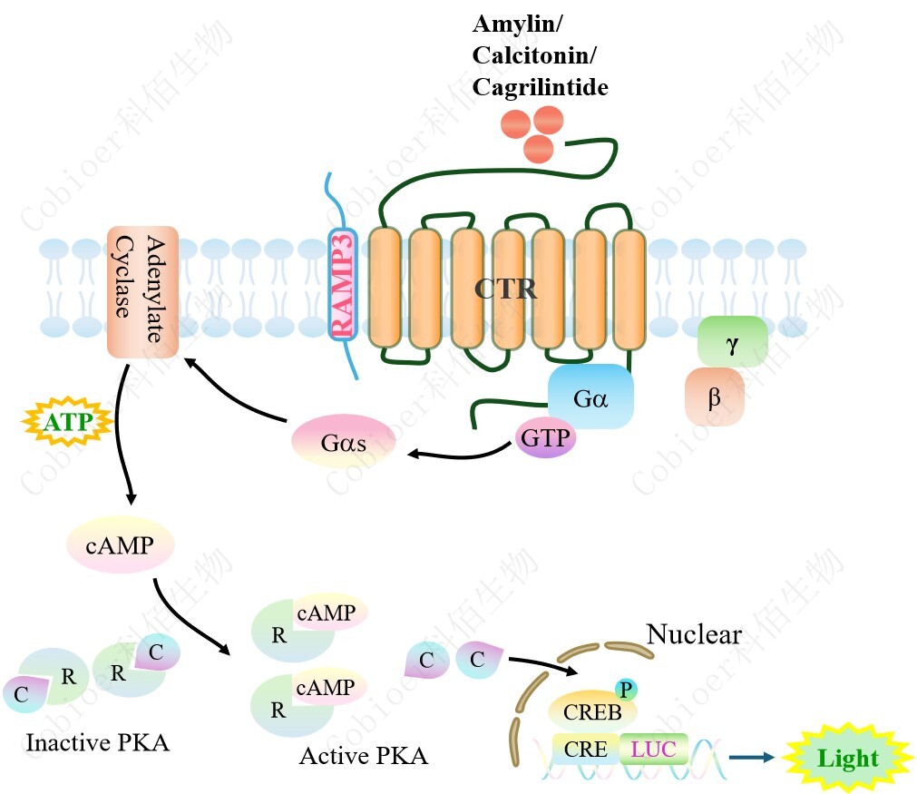 CTR&CTR&RAMP3 CRE-Luc HEK293 報(bào)告基因藥靶模型很好的模擬了體內(nèi) CTR 的信號(hào)轉(zhuǎn)導(dǎo) 過(guò)程,原理見下圖所示。![]() Figure 1. CTR&RAMP3 CRE-Luc HEK293 細(xì)胞模型原理圖 |