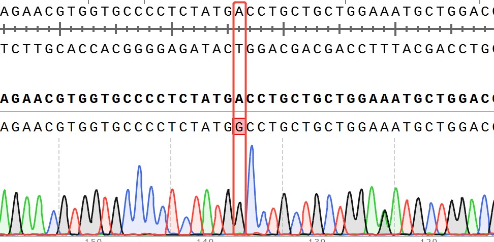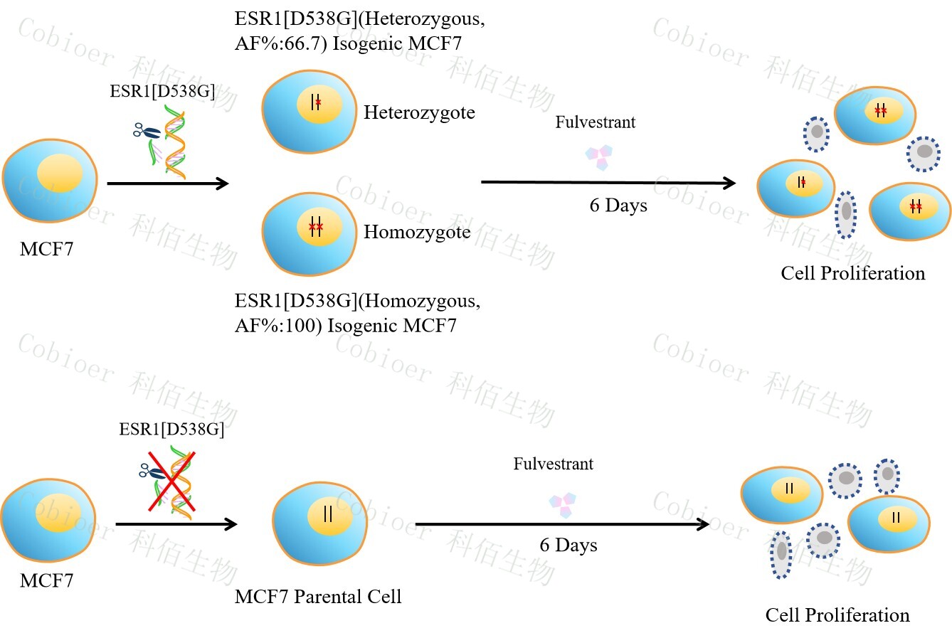 ESR1[D538G](Homozygous,AF%:100) Isogenic MCF7 藥靶細(xì)胞,通過基 因編輯的方式將 ESR1 的 538 位氨基酸天冬氨酸(D)突變?yōu)楦拾彼幔℅)。![]() Figure 1. ESR1[D538G](Homozygous,AF%:100) Isogenic MCF7 原理示意圖 |