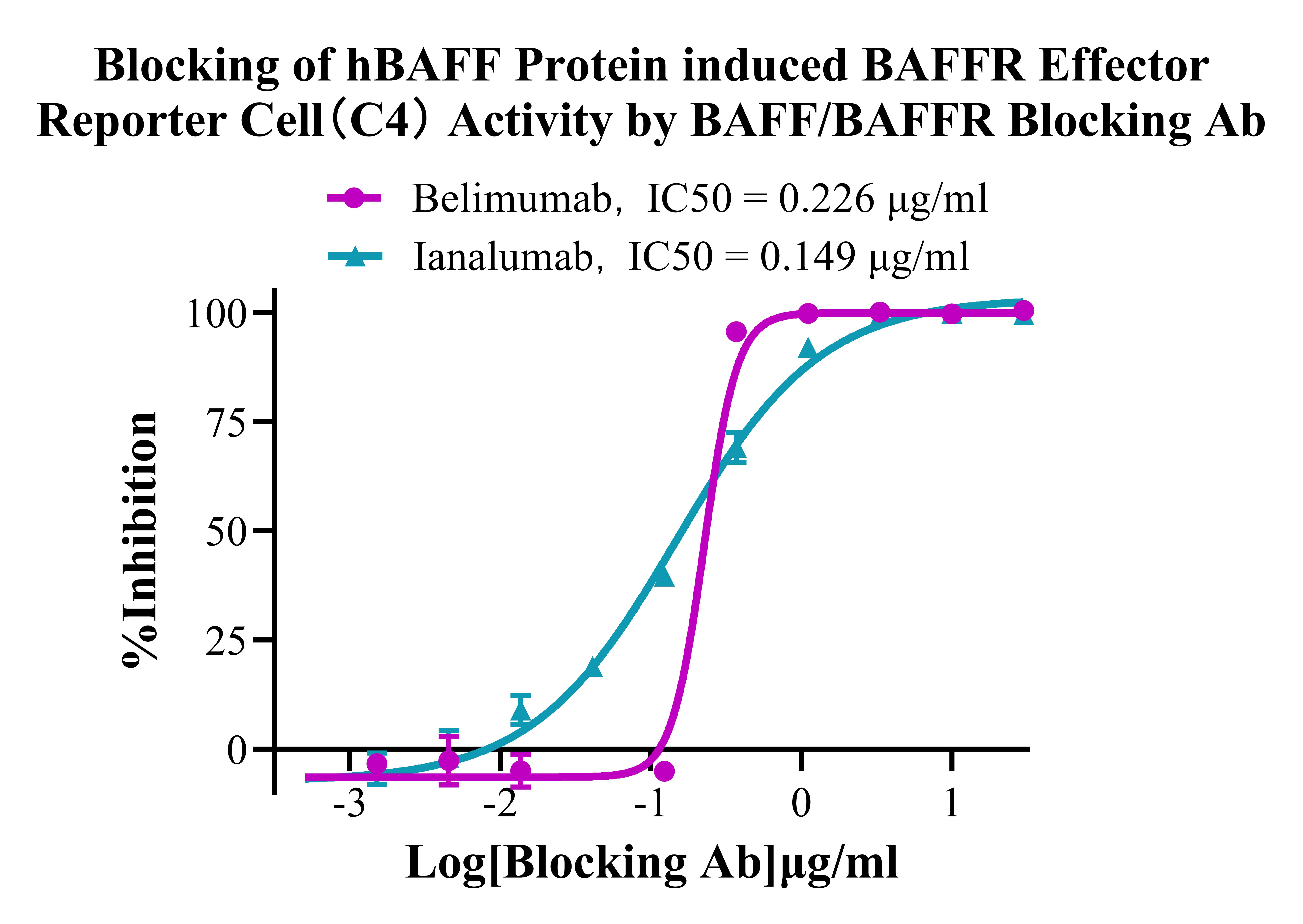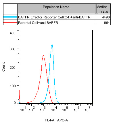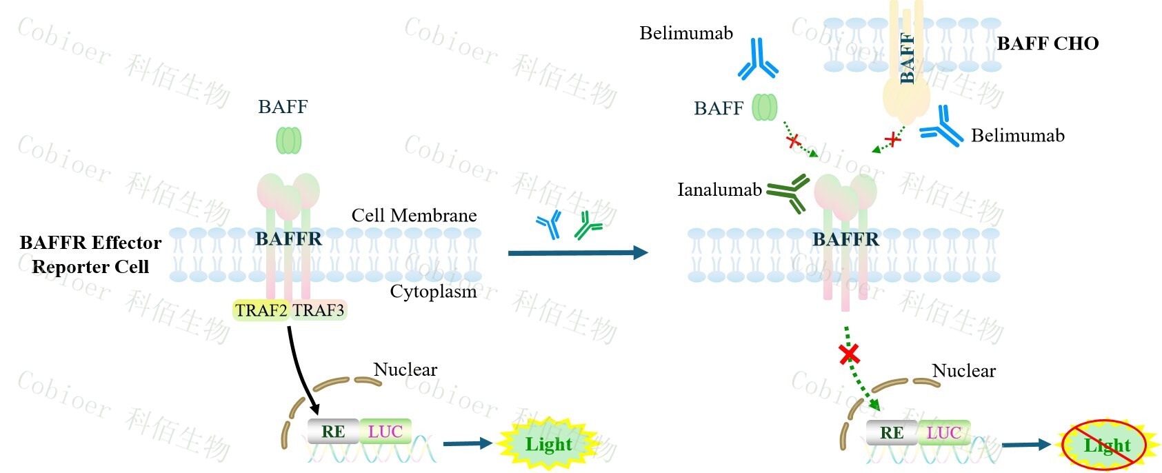 BAFFR Effector Reporter Cell 報告基因藥靶模型很好的模擬了體內 BAFF 的信號轉導過程,原理見下圖所示。![]() Figure 1. BAFFR Effector Reporter Cell 細胞模型原理圖 |