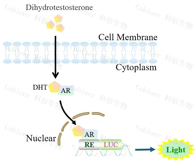 AR Reporter LNCAP Cell(DHT low sensitive)藥靶細(xì)胞,在由調(diào)控因子調(diào) 控并表達(dá)報告基因的重組細(xì)胞上,穩(wěn)定表達(dá)人 AR。雄激素的代謝產(chǎn)物 DHT(雙氫睪酮) 會與細(xì)胞上的 AR 結(jié)合,激活 AR 信號通路,原理見下圖所示。