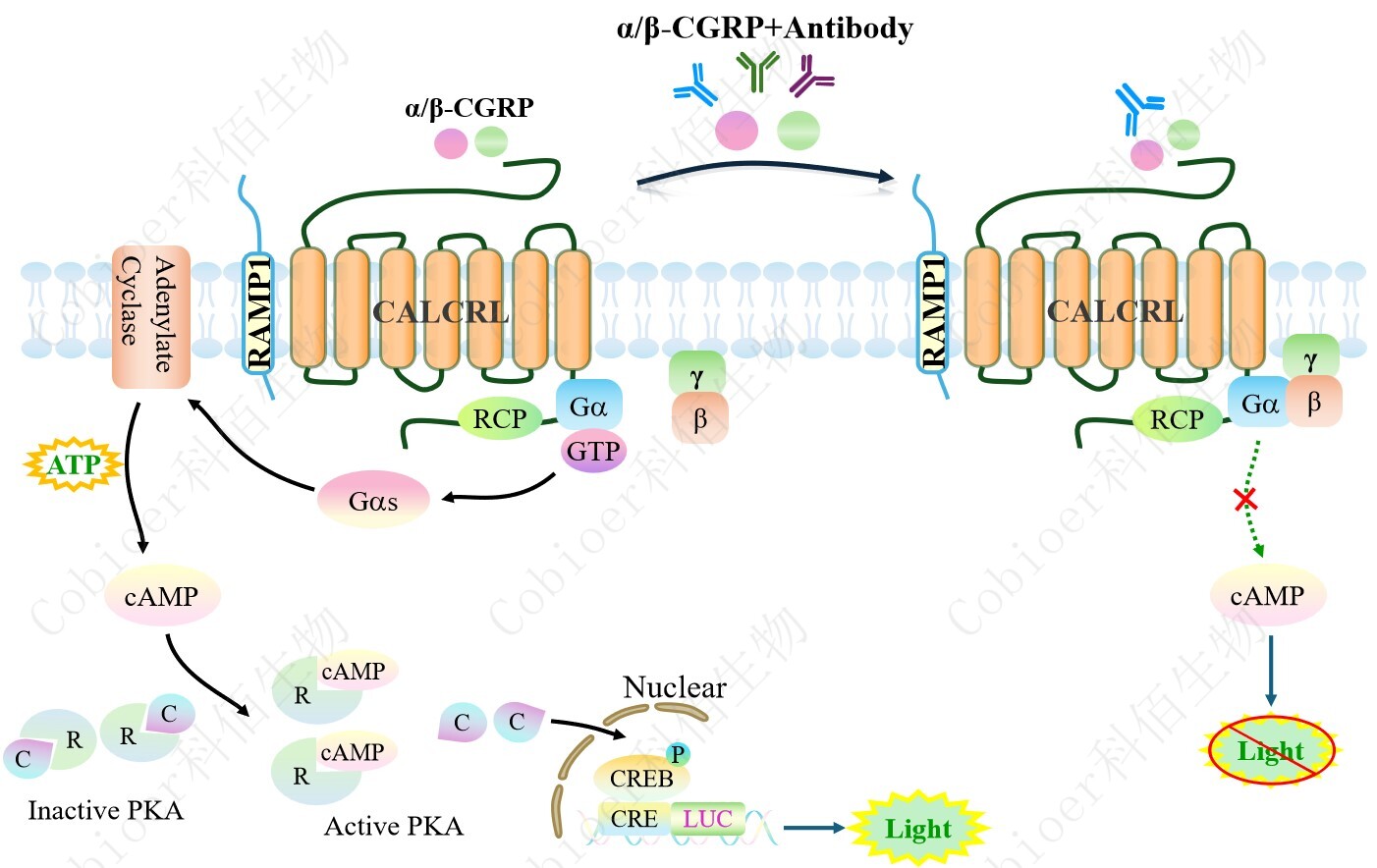 ![]() Figure 1. CALCRL&RAMP1 CRE-Luc HEK293 細(xì)胞模型原理圖 |