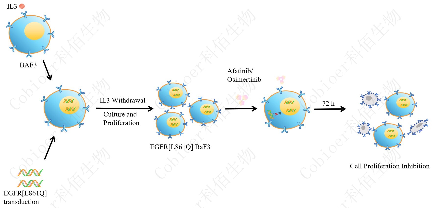 BaF3(小鼠原 B 細(xì)胞)的生長(zhǎng)和增殖需要 IL-3 的維持。通過(guò)引入各種表達(dá)激酶的基因, 能作為 BaF3 的驅(qū)動(dòng)基因,讓 BaF3 不再依賴 IL-3 而增殖,進(jìn)而激酶基因成為 BaF3 增殖依 賴的驅(qū)動(dòng)基因,用于評(píng)估小分子藥物對(duì)激酶的靶向抑制作用,原理及流程見下圖所示。 Figure 1. EGFR[L861Q] BaF3 細(xì)胞的構(gòu)建原理圖 |