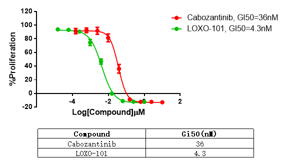 Figure 2. Anti-proliferation assay of two reference compounds on the TFG-NTRK1/BaF3 Stable Cell Line |