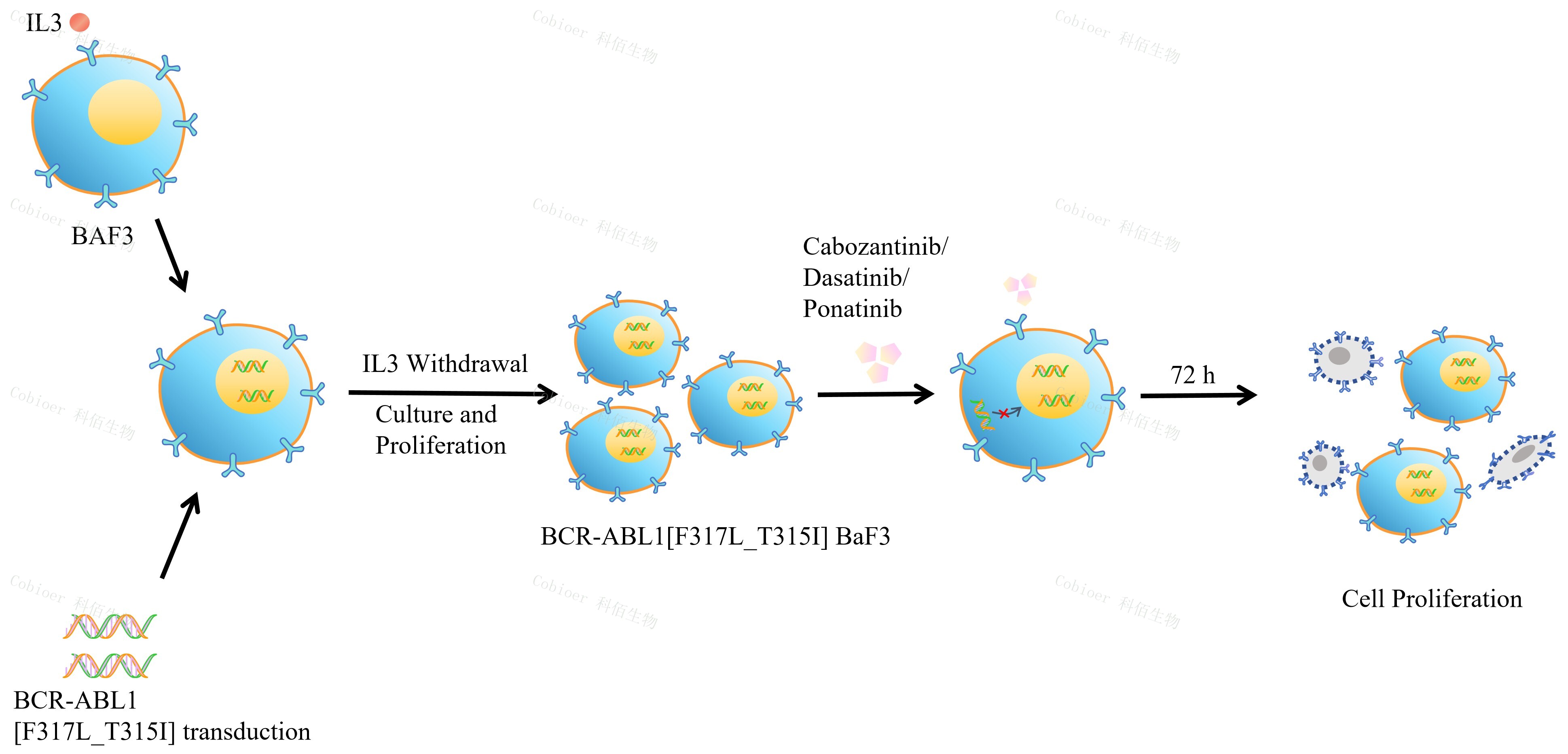 | BCR-ABL1[F317L_T315I] BaF3 藥靶細(xì)胞,通過轉(zhuǎn)導(dǎo)突變狀態(tài)的 BCR- ABL1[F317L_T315I] 基因到 BaF3 細(xì)胞系中 , 穩(wěn)定表達(dá)人突變形態(tài)下的 BCR- ABL1[F317L_T315I]基因。 BaF3(小鼠原 B 細(xì)胞)的生長和增殖需要 IL-3 的維持。通過引入各種表達(dá)激酶的基因, 能作為 BaF3 的驅(qū)動(dòng)基因,讓 BaF3 不再依賴 IL-3 而增殖,進(jìn)而激酶基因成為 BaF3 增殖依賴的驅(qū)動(dòng)基因,用于評(píng)估小分子藥物對(duì)激酶的靶向抑制作用,原理及流程見圖 1 所示。 ![]() Figure 1. BCR-ABL1[F317L_T315I] BaF3 細(xì)胞的構(gòu)建原理圖 |
