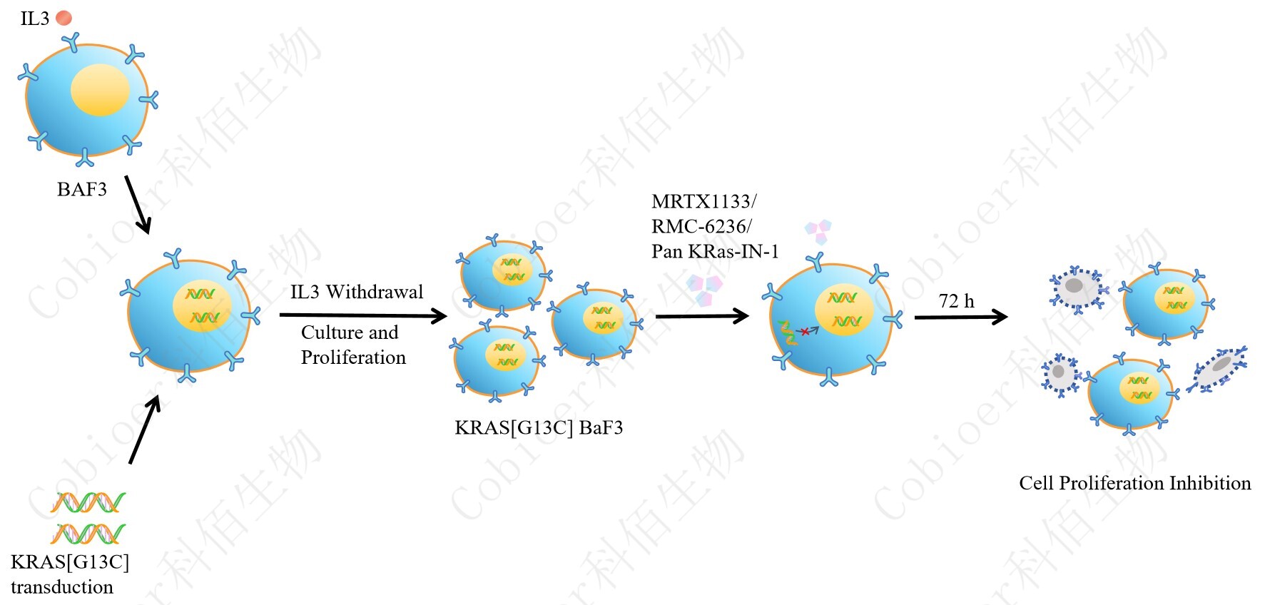 BaF3(小鼠原 B 細胞)的生長和增殖需要 IL-3 的維持。通過引入各種表達激酶的基因, 能作為 BaF3 的驅動基因,讓 BaF3 不再依賴 IL-3 而增殖,進而激酶基因成為 BaF3 增殖依賴的驅動基因,用于評估小分子藥物對激酶的靶向抑制作用,原理及流程見下圖所示。