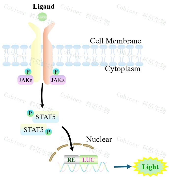 STAT5-Luc BaF3 報(bào)告基因細(xì)胞,是由 STAT5 調(diào)控并表達(dá) Luc 熒光素酶 報(bào)告基因的 BaF3 細(xì)胞。IL3 與受體結(jié)合,激活 STAT5 的原理見下圖所示。![]() Figure 1. STAT5-Luc BaF3 細(xì)胞模型原理圖 |